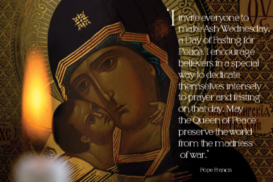 And now I would like to appeal to everyone, believers and non-believers alike. Jesus taught us that the diabolical senselessness of violence is answered with God's weapons, with prayer and fasting. I invite everyone to make next 2 March, Ash Wednesday, a Day of Fasting for Peace. I encourage believers in a special way to dedicate themselves intensely to prayer and fasting on that day. May the Queen of Peace preserve the world from the madness of war."