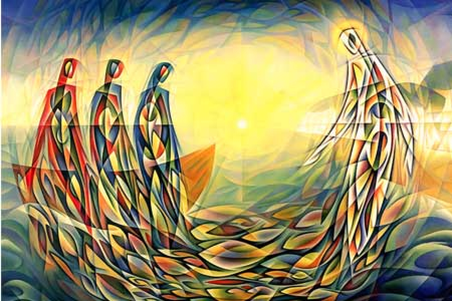 It was light by now and there stood Jesus on the shore, though the disciples did not realise that it was Jesus. Jesus called out, ‘Have you caught anything, friends?’ And when they answered, ‘No,’ he said, ‘Throw the net out to starboard and you’ll find something.’ So they dropped the net, and there were so many fish that they could not haul it in. The disciple Jesus loved said to Peter, ‘It is the Lord.’ At these words ‘It is the Lord,’ Simon Peter, who had practically nothing on, wrapped his cloak round him and jumped into the water. The other disciples came on in the boat, towing the net and the fish; they were only about a hundred yards from land.