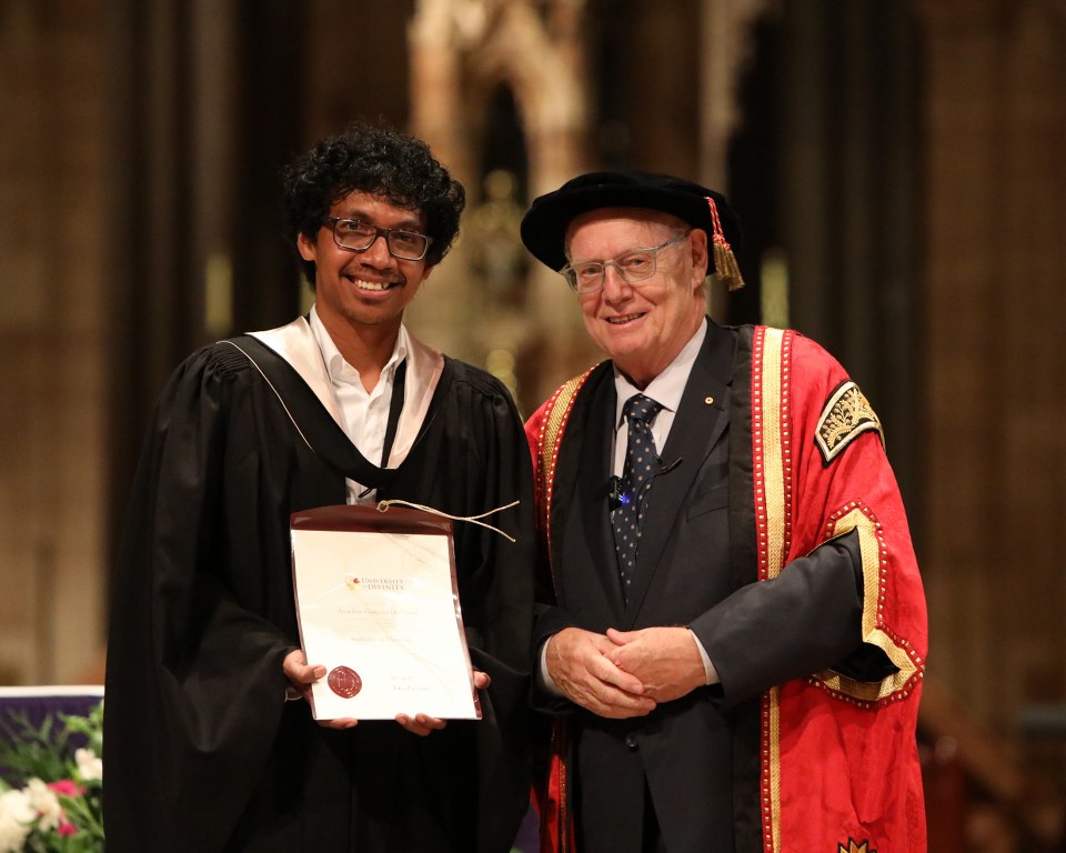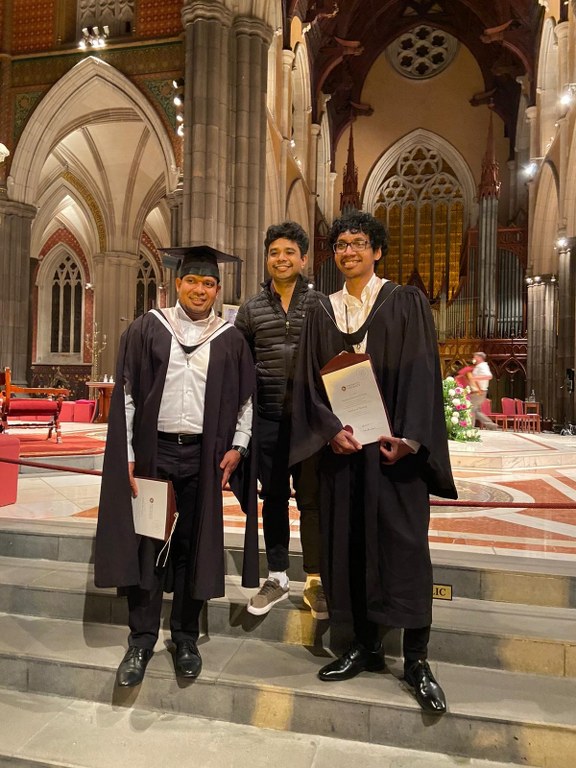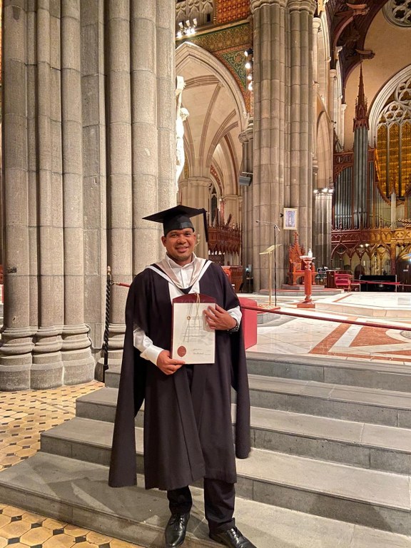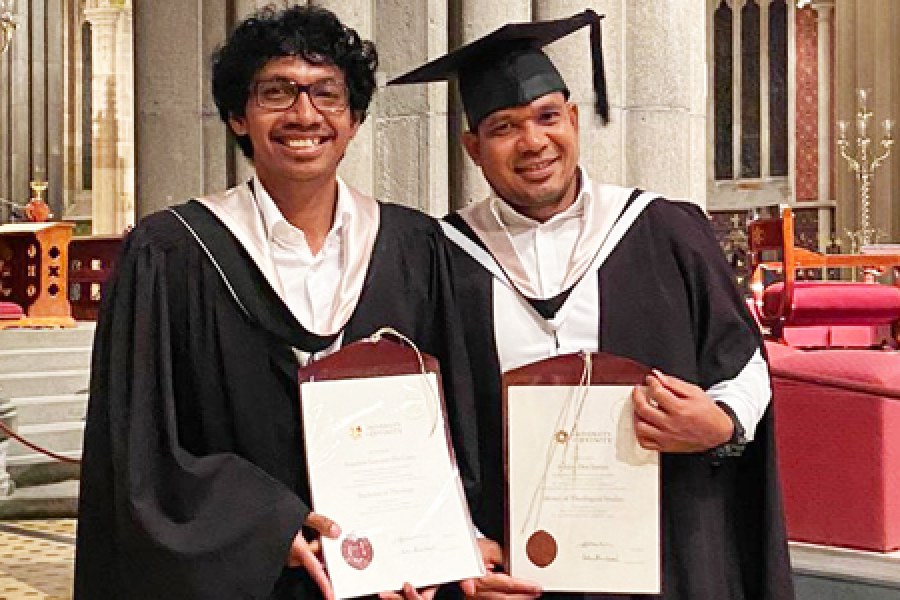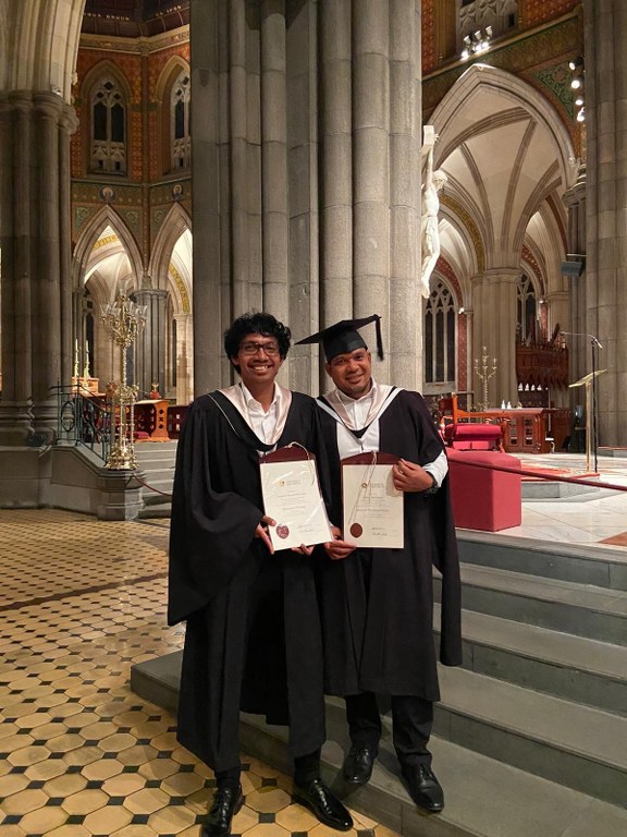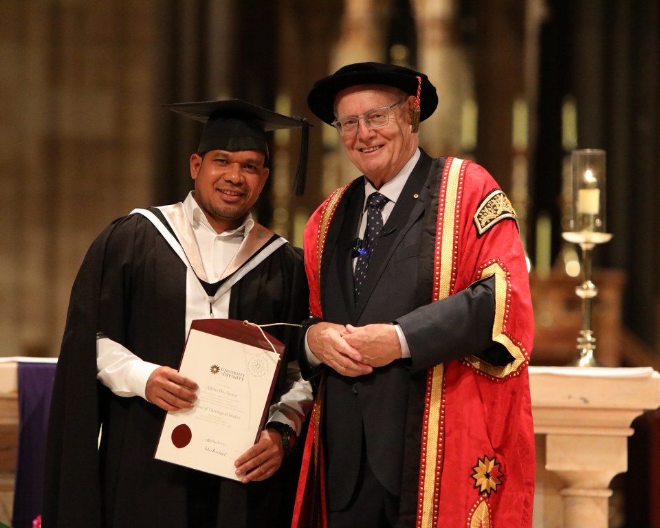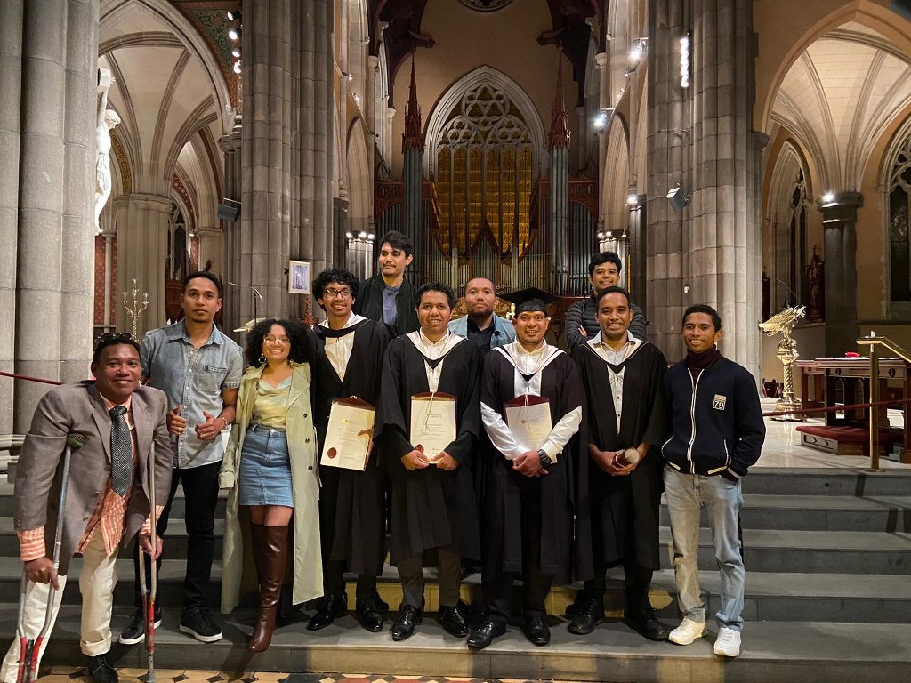Fr Albino Dos Santos graduated with a Masters degree in Theological Studies and Br Anacleto Guterres Da Costa with a Bachelors degree in Theology on 24 March at St Patrick's Cathedral, Melbourne. They were among 379 students of the University of Divinity to receive awards during the ceremony. A crowd of over 800 family and friends gathered in the Cathedral to witness the presentation of awards. Fr Albino, now ministering in our parishes in Coorparoo, Queensland, received his Bachelor of Theology degree in 2021. Br Anacleto has just begun his studies for the Masters degree in Theological Studies at the University of Divinity.