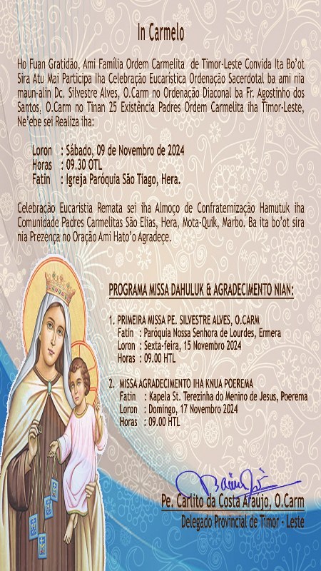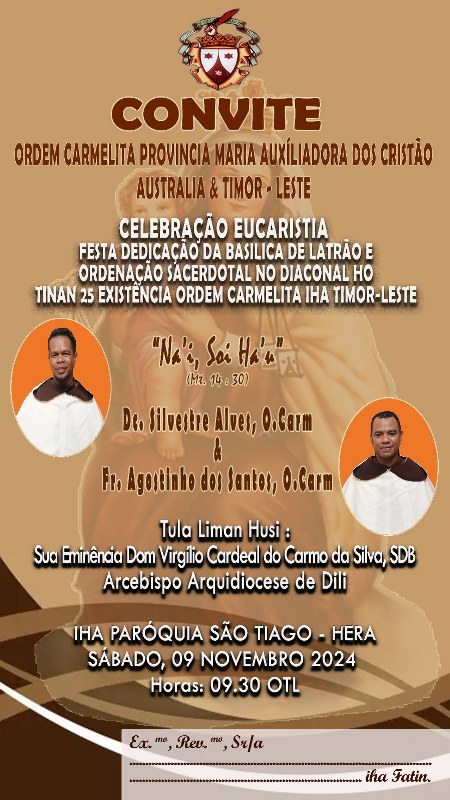 The Ordination Mass will take place in St Jomes Church, Hera. Silvestre will celebrate Masses of Thanksgiving on Friday 15 November in Our Lady of Lourdes parish, Ermera and Sunday 17 November in the Chapel of St Thérèse of the Child Jesus, Poerema.