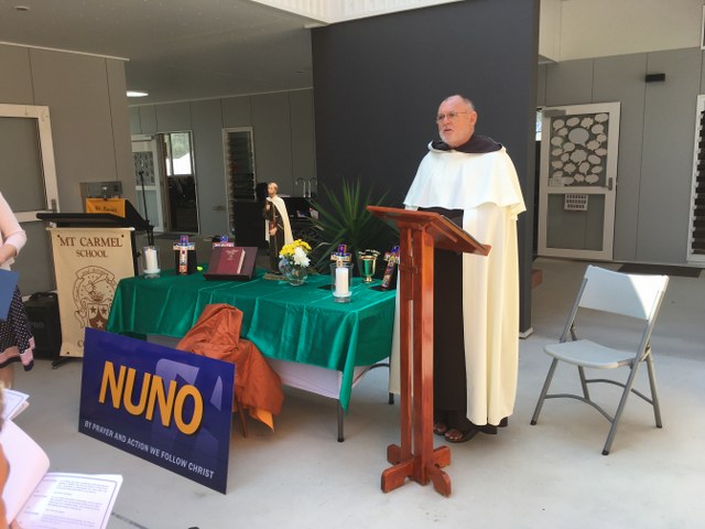 Fr Wayne Stanhope OCarm. led the ceremony of blessing and naming of the building. In his reflection during the ceremony Fr Wayne highlighted the strong sense of social justice and care for the poor that Nuno lived out in his life as a lay Carmelite brother. Fr Wayne encouraged students and teachers to take the example of St Nuno as an inspiration for their responses to social justice issues in the local community. Fr Wayne also presented a statue of St Nuno for the new building to the school, a gift from the Carmelites of Portugal.