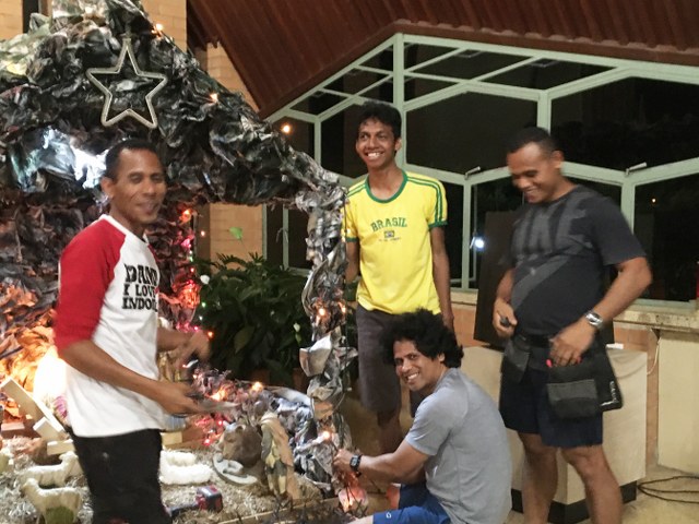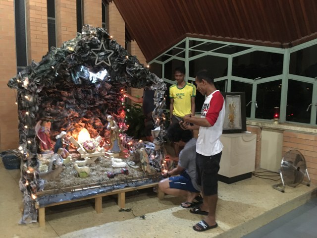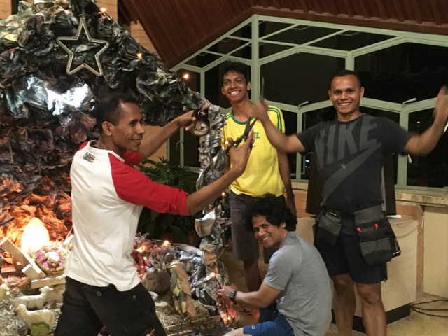 In our parish at Coorparoo (QLD) our Timorese Carmelites have been getting the Church ready for Christmas. They have constructed a Christmas Crib in traditional Timorese style. Fr Janu and Brs Donato, José and Anacleto worked late into the night yesterday assembling the crib and adding a few contemporary features like Christmas lights. Well done, brothers!
