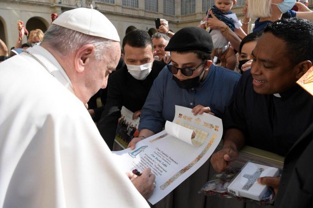 “Beside me was a young man who came from a small town called Teramo in the Abruzzo region. We met while we were together at the audience venue. We became acquainted and began to talk with each other. Because he brought a lot of things, he asked for my help to carrying the Cross and a box of Rosaries. In the photo he is holding a Papal Blessing which he ordered for his parish’s sixtieth anniversary. Through that meeting we became friends, and he invited me to come to visit his place.”