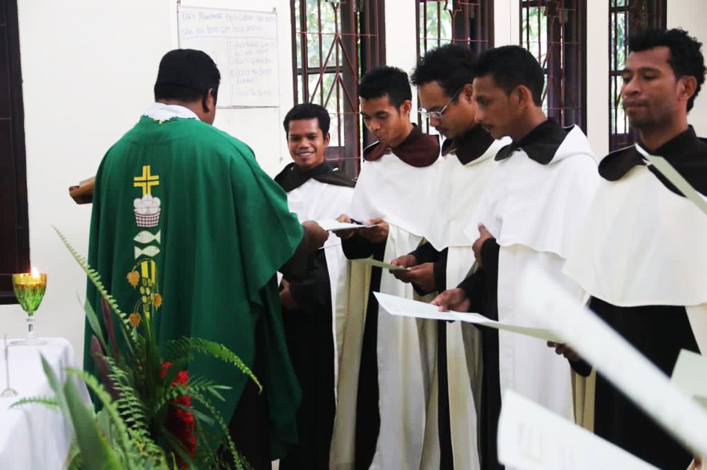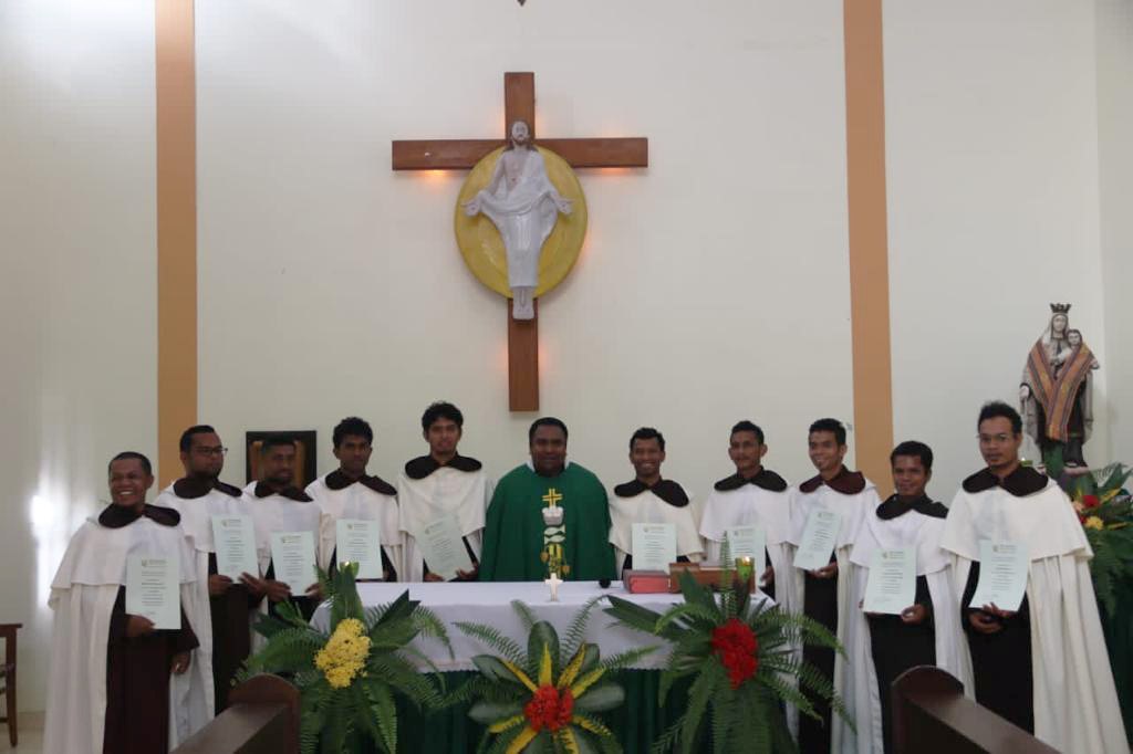 Yesterday 15 of our young Carmelites in Timor received the ministries of Lector (reader) and Acolyte during Mass in our community at Hera. Lectors proclaim the Word of God in liturgical assemblies, instruct adults and children in the faith and prepare them to receive the sacraments. Acolytes assist the priest during the celebration of the Eucharist, holding the Missal, preparing the altar and the vessels and cleaning them after Communion. They may also distribute Communion if necessary. For those preparing for Priesthood in the Church, receiving these ministries is another step on their journey to Ordination.