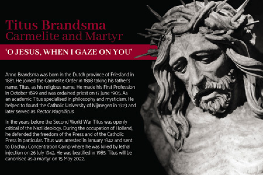 Over two days, while in Scheveningen Prison, Titus Brandsma penned his moving prayer-poem, Before An Image of Jesus. In it Titus describes his loving friendship with Jesus, how his awareness of Jesus' love sparks a love deep inside himself and his desire to share everything with Jesus, even his suffering.